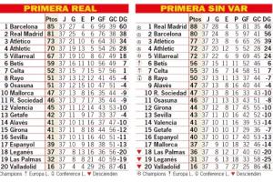 體育資訊05月19日訊 目前,巴薩領(lǐng)先皇馬4分,已經(jīng)提前獲得西甲冠軍。阿斯報(bào)發(fā)文,假設(shè)了在沒有VAR情況下本賽季西甲的積分榜排名?;蜀R將8分領(lǐng)跑奪冠。