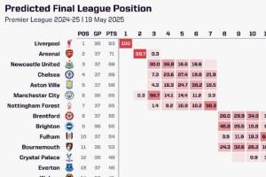 體育資訊05月19日訊 Opta預測英超各支球隊前五概率: