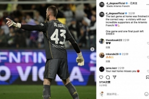 賽后,紫百合門將德赫亞更新社交媒體鼓勵(lì)球隊(duì)在末輪最后一搏,并寫道:“主場(chǎng)收官戰(zhàn)在弗蘭基球場(chǎng)以應(yīng)有的方式落幕,在主場(chǎng)與不可思議的球迷們共享勝利??????。還剩最后一場(chǎng)比賽,最后一搏!”