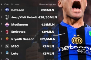 體育資訊5月19日訊 不久前,Calcio e Finanza公布了意甲球隊球衣主贊助的排行榜,國米以3000萬歐一年排在第一。