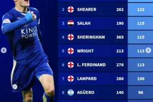 27歲8個月后英超進(jìn)球榜:瓦爾迪145球居首,希勒次席&薩拉赫第三