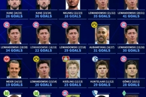 體育資訊5月20日訊 本賽季凱恩以26球蟬聯(lián)德甲射手王,德轉也盤點了德甲近20個賽季最佳射手,具體如下: