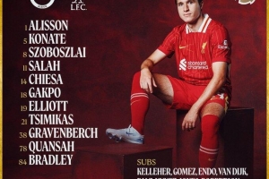 利物浦首發(fā):1-阿利森、5-科納特、8-索博斯洛伊、11-薩拉赫、14-基耶薩、18-加克波、19-埃利奧特、21-齊米卡斯、38-赫拉芬貝赫、78-寬薩、84-布拉德利