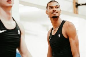 文班和Maxime Raynaud一同訓練,后者是今年參選的新秀中鋒