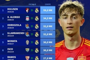 1、懷森,2025-26賽季,伯恩茅斯→皇馬,5900萬歐元