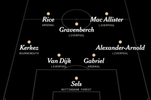 后衛(wèi):科爾克茲(伯恩茅斯)、范迪克(利物浦)、加布里埃爾(阿森納)、阿諾德(利物浦)