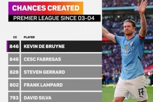 據(jù)OptaJoe的數(shù)據(jù)統(tǒng)計,自Opta有記錄以來(2003-04賽季開始),德布勞內(nèi)在英超聯(lián)賽中為隊友創(chuàng)造846次機會,沒有哪名球員比他更多。