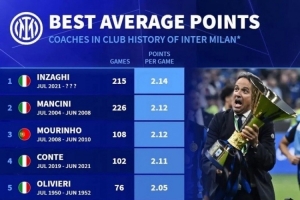 體育資訊5月21日訊 德國轉(zhuǎn)會(huì)市場統(tǒng)計(jì)了國米主帥的場均積分,并列出榜單,小因扎吉2.14分居首,曼奇尼、穆里尼奧2.12分次席。