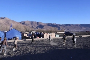 定日縣很多孩子非常喜歡足球,在森嘎村安置點,一群孩子在一處空地上踢起了足球,足球在孩子們的腳下來回傳遞,臉上洋溢著歡快的笑容,似乎在此刻,他們在運動中漸漸忘記地震給他們帶來心靈上的傷痛。