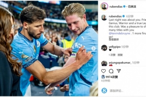 體育資訊5月21日訊 曼城后衛(wèi)魯本-迪亞斯更新社媒動(dòng)態(tài),與今夏離隊(duì)的德布勞內(nèi)告別。