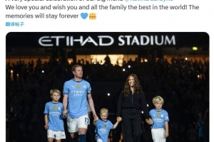 體育資訊5月21日訊 德布勞內(nèi)在英超第37輪曼城3-1戰(zhàn)勝伯恩茅斯的比賽中完成了他在曼城主場(chǎng)的最后一場(chǎng)比賽,比賽結(jié)束后,曼城中場(chǎng)B席在社交媒體中發(fā)文,對(duì)德布勞內(nèi)進(jìn)行了告別和祝福。