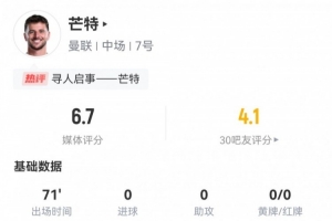 體育資訊5月22日訊 正在進行的歐聯(lián)杯決賽,曼聯(lián)0-1熱刺。此役芒特首發(fā)71分鐘被換下,球員全場重點數(shù)據(jù)如下↓