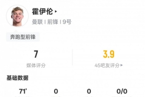 體育資訊5月22日訊 歐聯(lián)杯決賽,曼聯(lián)對陣熱刺,霍伊倫首發(fā)出戰(zhàn),2次射門1次射正,送出1次關(guān)鍵傳球,評分7.0。