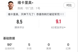 本場(chǎng)比賽熱刺門將維卡里奧高接抵擋,全場(chǎng)比賽完成了5次撲救,賽后他也是獲得了8.5分的全場(chǎng)最高評(píng)分。