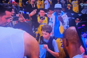 賽后文班亞馬和保羅來到場邊,為湖人主帥雷迪克的兩個兒子簽名并合影留念。