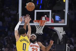 常規(guī)時間最后時刻,步行者指揮官哈利伯頓運球推進到前場,在尼克斯中鋒米切爾-羅賓遜面前撤步踩著三分線壓哨出手,皮球彈得很高,隨后掉進籃筐,將比賽拖進加時。加時賽最后2分鐘,哈利伯頓2中1。