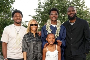 詹姆斯夫婦的小兒子布萊斯昨日高中畢業(yè),詹姆斯全家參加了布萊斯的畢業(yè)典禮并合影留念。