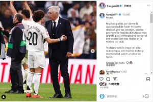 體育資訊5月24日訊 皇馬主帥安切洛蒂今夏離任,弗蘭-加西亞更新社媒動(dòng)態(tài),與安帥告別。