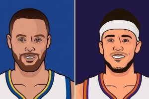 “庫(kù)里賽季場(chǎng)均24.5分6.0助攻,投籃命中率44.8%,入選最佳陣容二陣;布克賽季場(chǎng)均25.6分7.1助攻,投籃命中率46.1%,無(wú)緣最佳陣容?!盨tatMuse寫道。