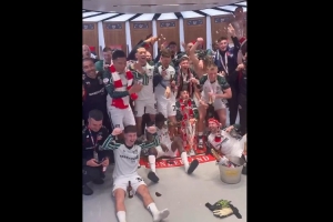桑德蘭官方社媒發(fā)布視頻,球員在更衣室內(nèi)慶祝晉級,桑德蘭社媒寫道:慶祝時間??