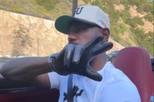 詹姆斯轉(zhuǎn)發(fā)了他的朋友發(fā)布的一段自拍,他和友人坐在一輛敞篷跑車上前往郊區(qū)兜風(fēng),車上音響同時(shí)播放著音樂。