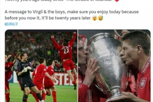 卡拉格社媒曬出當(dāng)時(shí)的照片,并寫道:“今天是‘伊斯坦布爾奇跡’二十周年紀(jì)念日。”
