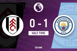 上半場傷停補(bǔ)時1分鐘,半場結(jié)束,曼城暫1-0富勒姆。