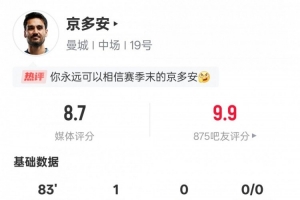 體育資訊5月26日訊 英超第38輪,曼城對(duì)陣富勒姆,京多安首發(fā)出戰(zhàn),打進(jìn)1粒進(jìn)球,制造1次點(diǎn)球,送出5次關(guān)鍵傳球,評(píng)分8.7。