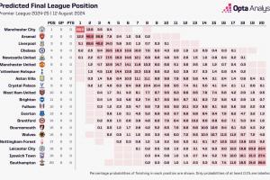 2024年8月12日,OPTA超算模擬10000次后得出的24/25賽季英超排名預(yù)測(cè)