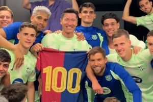 萊萬加盟巴薩至今出戰(zhàn)147場比賽,打進101球(20助),賽后他獲贈巴薩生涯百球里程碑紀念球衣,并手拿球衣與隊友們在更衣室內合影。