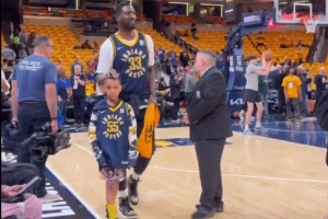 前NBA中鋒希伯特帶兒子現(xiàn)身主場支持步行者。