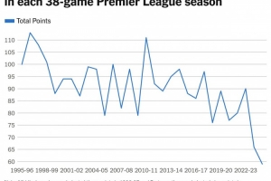 體育資訊5月26日訊 本賽季的英超聯(lián)賽塵埃落定,三支降級球隊總計拿到59分,打破上賽季的紀錄(66分),英超38輪賽制時期最少。