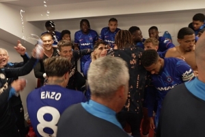 賽后切爾西球員們在更衣室內(nèi)慶祝并合影,俱樂部官方社媒曬出視頻,配文:“英超24-25賽季收官?!?/p>