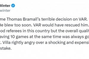 記者Henry Winte在社交媒體上寫道:“你不能把托馬斯-布拉莫爾(主裁)的糟糕判罰歸咎于VAR,這完全是裁判自身的問題。他吹哨太早了,VAR本可以救他?!?/p>