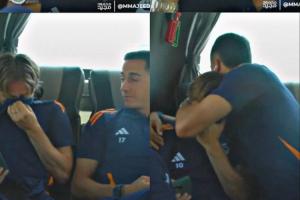 與皇馬每個(gè)主場比賽的慣例一樣,球員們在皇馬體育城集合,莫德里奇駕車抵達(dá)時(shí)不禁感慨:“這條路我閉著眼睛也能開過來”。隨后,他和隊(duì)友們一同登上皇馬大巴。前往伯納烏球場的路上,莫德里奇突然情緒失控,掩面落淚。很可能同樣迎來告別戰(zhàn)的巴斯克斯,毫不猶豫地上前擁抱安慰莫德里奇。