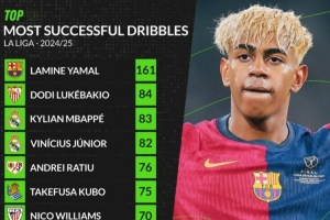 體育資訊5月26日訊 本賽季西甲落幕,數(shù)據(jù)網(wǎng)站W(wǎng)hoscored也盤點了本賽季西甲成功過人次數(shù)榜,亞馬爾以161次遙遙領先,具體如下: