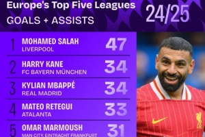 體育資訊5月27日訊 Squawka列本賽季五大聯(lián)賽球員進(jìn)球+助攻榜,薩拉赫47球居首,凱恩、姆巴佩34球并列第二。