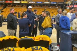 本場(chǎng)比賽,前步行者球星丹尼-格蘭杰現(xiàn)身步行者主場(chǎng)觀戰(zhàn)。