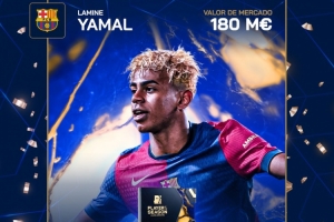 體育資訊5月28日訊 德國轉(zhuǎn)會(huì)市場(chǎng)網(wǎng)宣布,亞馬爾被用戶票選為本賽季西甲最佳球員。