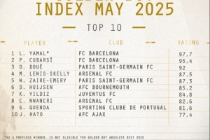 體育資訊5月29日訊 歐洲五大聯(lián)賽已經(jīng)落下帷幕,作為金童獎(jiǎng)的主辦方,《都靈體育報(bào)》對獎(jiǎng)項(xiàng)爭奪者進(jìn)行了排名,亞馬爾以97.7分居首,他的巴薩隊(duì)友庫巴西以95.4分位居次席。
