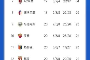體育資訊01月15日訊 本輪意甲,米蘭2-1擊敗科莫,尤文1-1戰(zhàn)平亞特蘭大。最新積分榜情況如上圖。