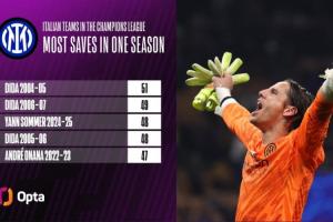 意大利球隊歐冠單賽季撲救次數(shù)排行