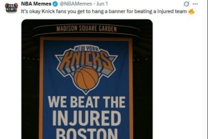 賽后,美媒NBA Memes曬出一張PS的尼克斯旗幟照,配文寫(xiě)道:“沒(méi)關(guān)系,尼克斯球迷,你們可以因?yàn)閾魯∫恢軅±_的球隊(duì)而掛上橫幅?!?/p>