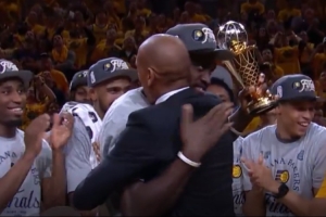 賽后,步行者名宿雷吉-米勒為西卡頒發(fā)東決MVP拉里-伯德杯。