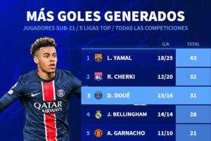 體育資訊06月02日訊 德轉(zhuǎn)統(tǒng)計了本賽季五大聯(lián)賽21歲及以下球員的進球+助攻數(shù)據(jù),杜埃憑借在歐冠決賽的2球1助,進球+助攻數(shù)突破30,來到進球+助攻榜第三。