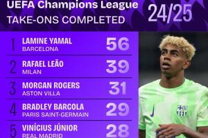 體育資訊06月02日訊 24/25賽季歐冠過人次數(shù)排名出爐,亞馬爾56次的過人數(shù)讓他成為本屆歐冠完成過人次數(shù)最多的球員,同時(shí),他在西甲的161次成功過人也讓他成為本賽季五大聯(lián)賽完成過人次數(shù)最多的球員。