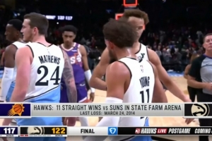 體育資訊1月15日訊 NBA常規(guī)賽,老鷹在主場(chǎng)以122-117擊敗太陽(yáng)。