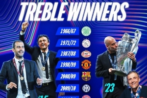 恩里克成為瓜迪奧拉之后又一位兩次贏得過三冠王的教練,瓜迪奧拉曾在2009年和2023年兩次實(shí)現(xiàn)三冠王。