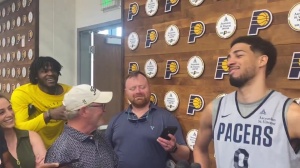 哈利伯頓接受采訪,賈雷斯-沃克拄拐在一旁:“不好意思?請問你可以從Culver's幫我買兩份培根芝士漢堡和薯?xiàng)l嗎?”