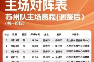6月29日第5輪第29場(chǎng)蘇州隊(duì)VS揚(yáng)州隊(duì),比賽場(chǎng)地移至昆山市奧體中心體育場(chǎng),開球時(shí)間調(diào)整為6月29日19:00。